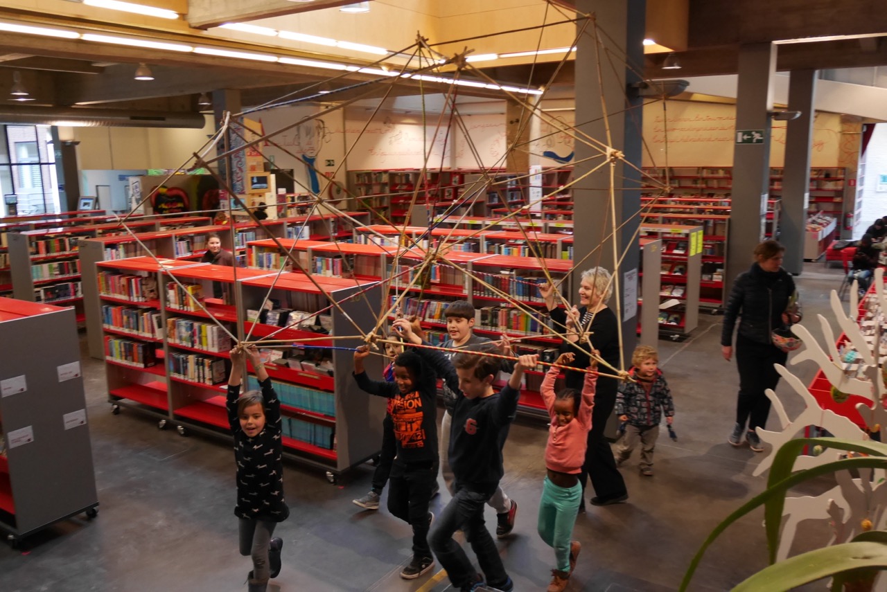 In de bibliotheek Permeke te Antwerpen konden de jonge lezers deze keer aan de slag met bamboe ! Een duurzaam atelier voor de bouwers van onze toekomst .