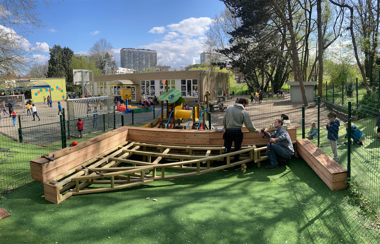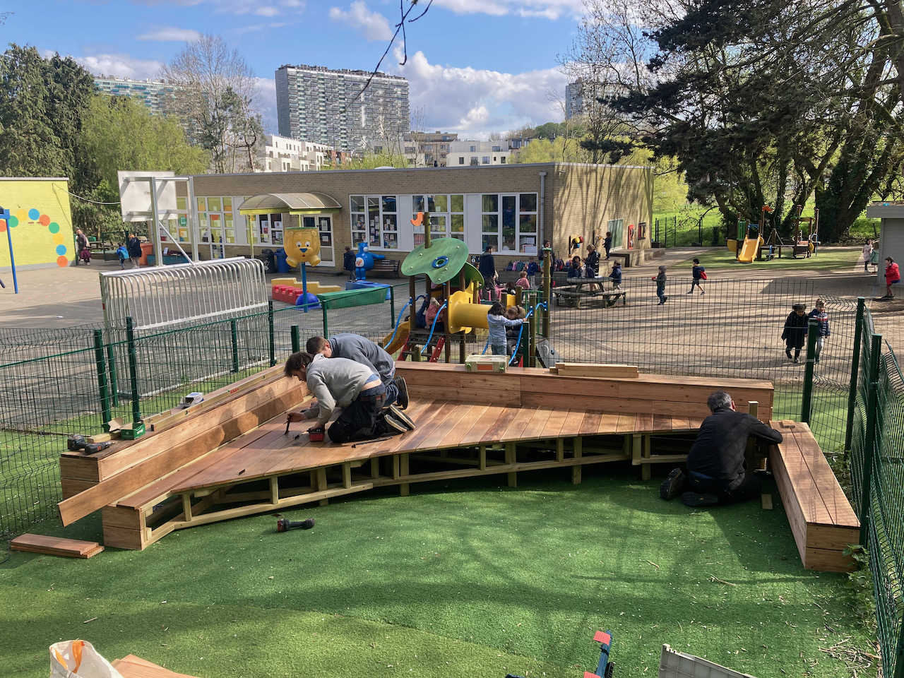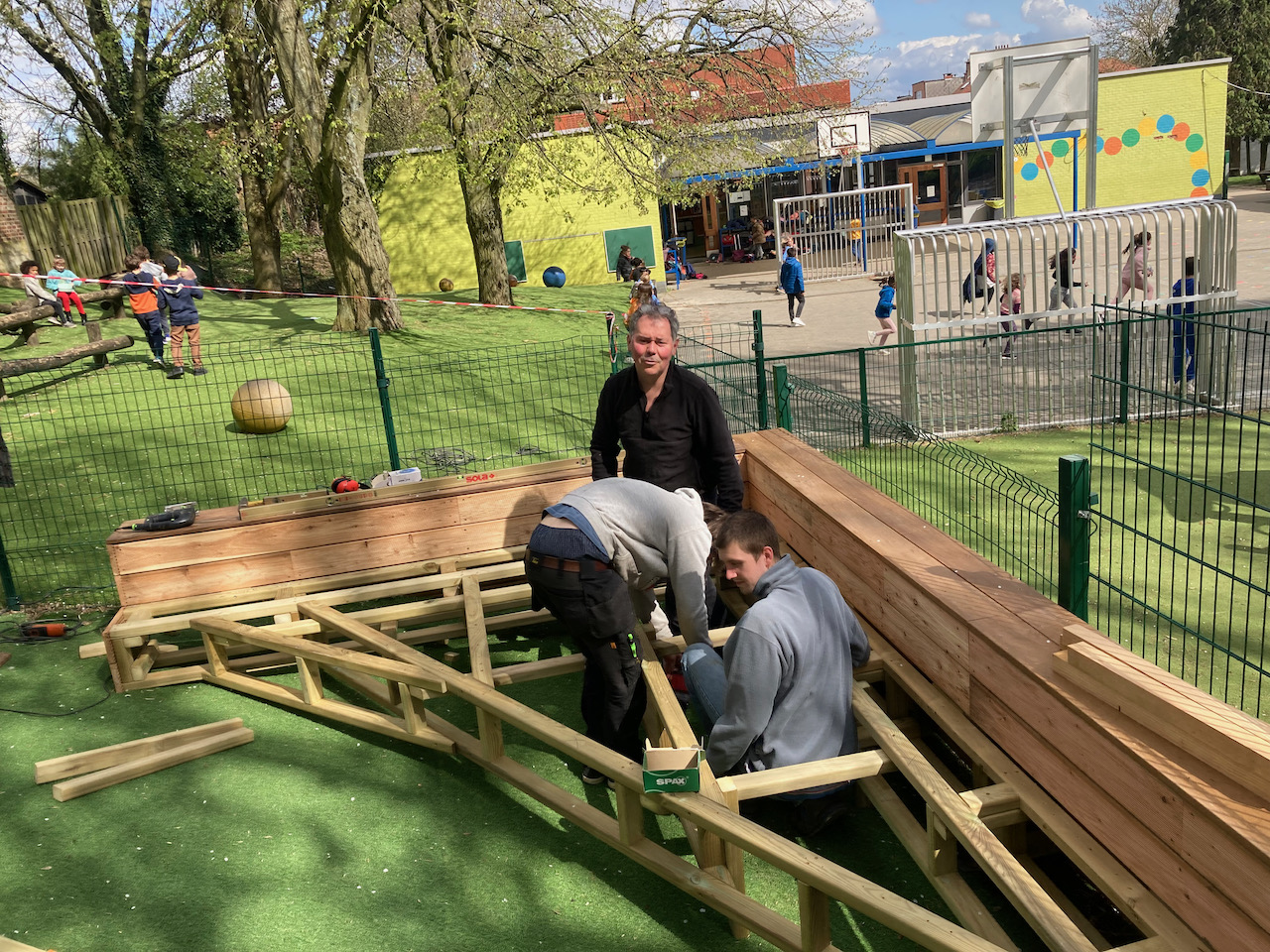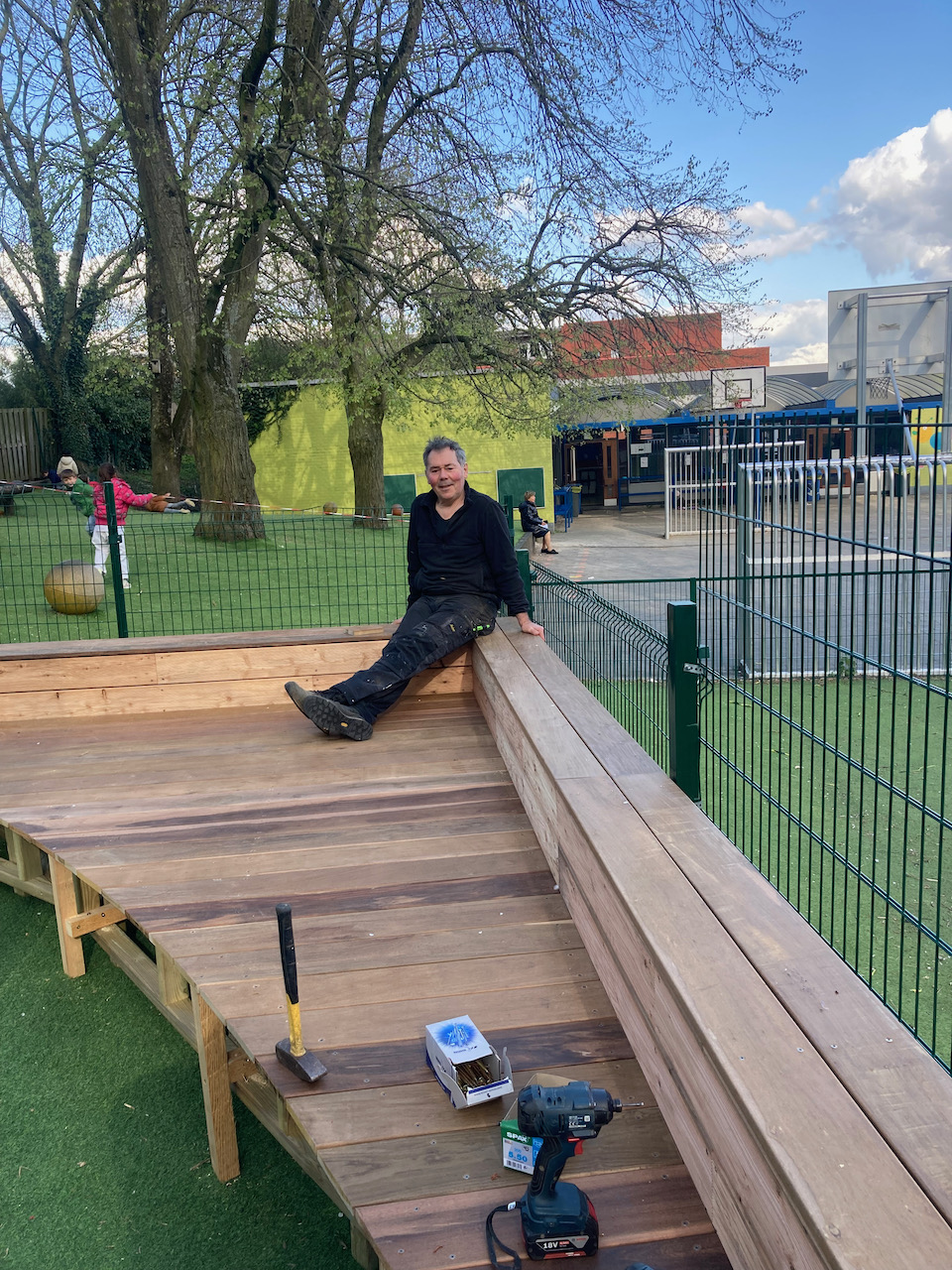 Een mooi staaltje houtwerk dat alvast bij de kinderen goed in de smaak viel … ze kijken er naar uit om er hun boekjes te lezen, de verjaardagen te vieren, te dansen en nog zoveel meer… laat de zon maar komen dan kunnen die openluchtklassen beginnen.