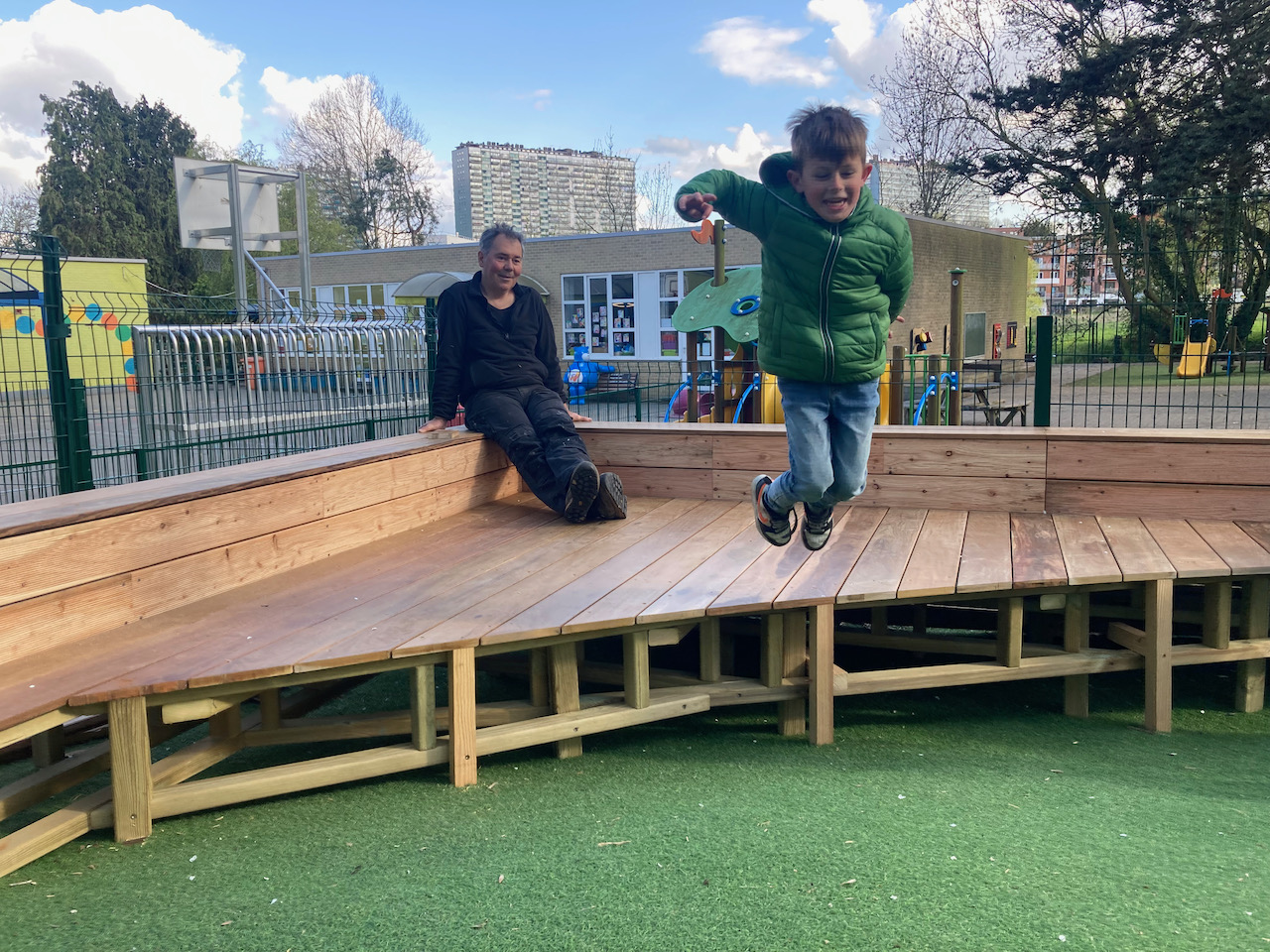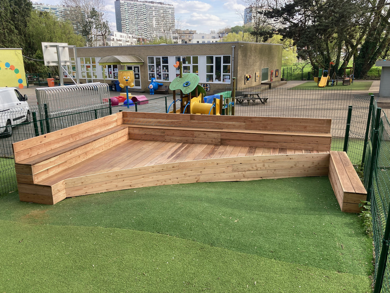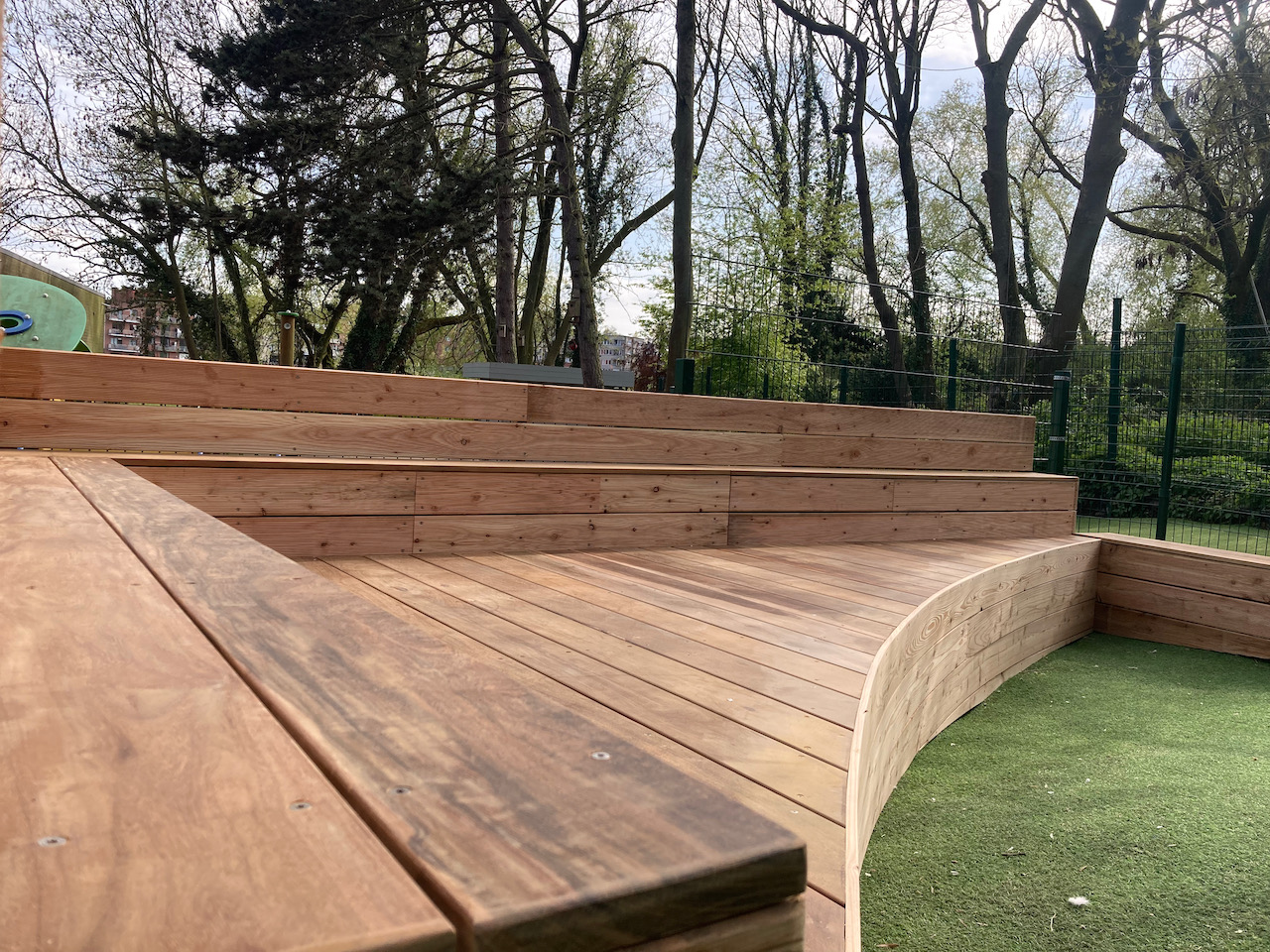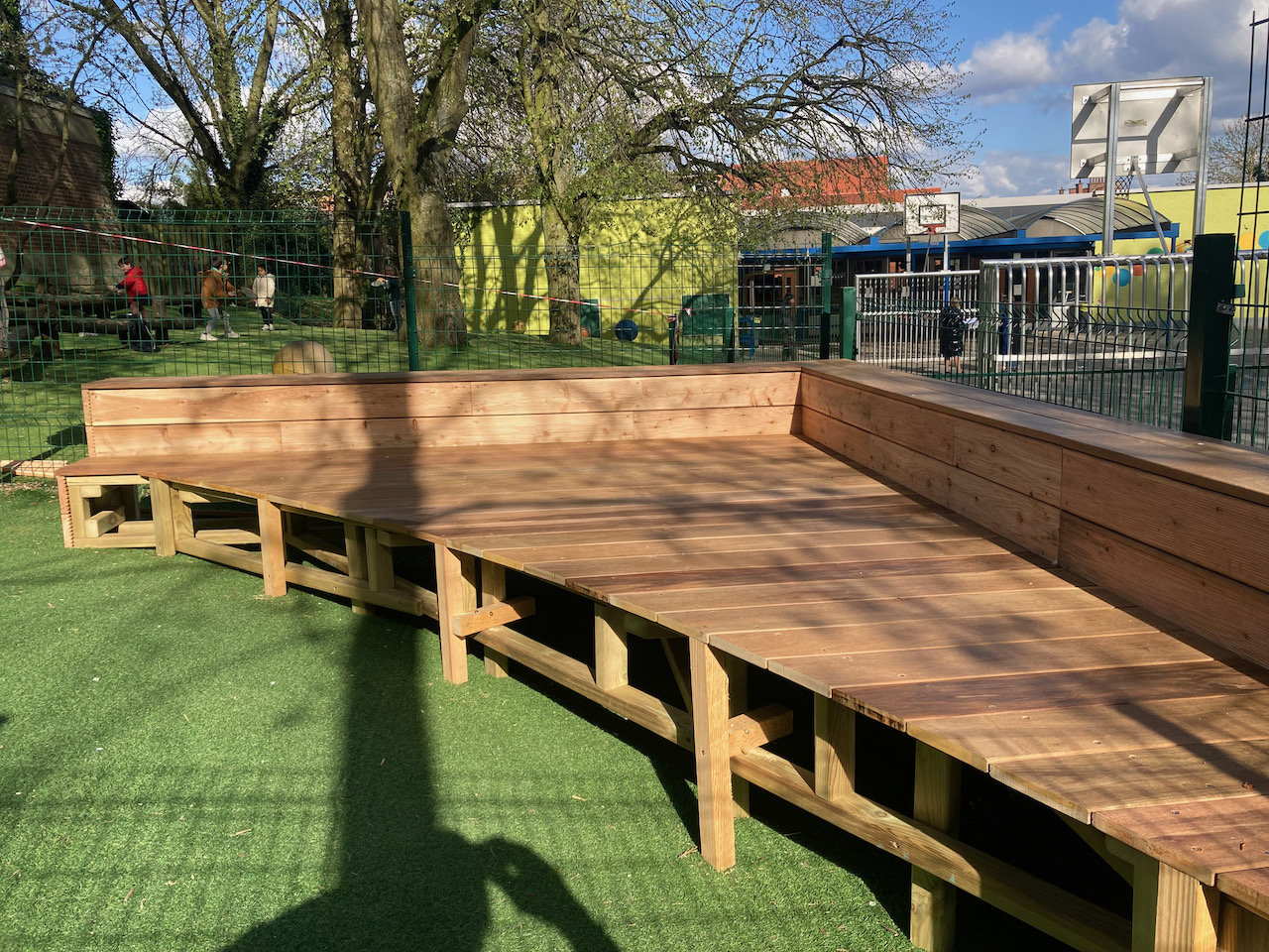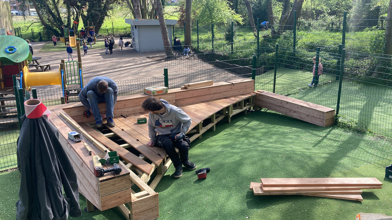 Samen met L’aissance du bois tekende en bouwde Mister box een nieuw podium voor GO basisschool Zavelput.