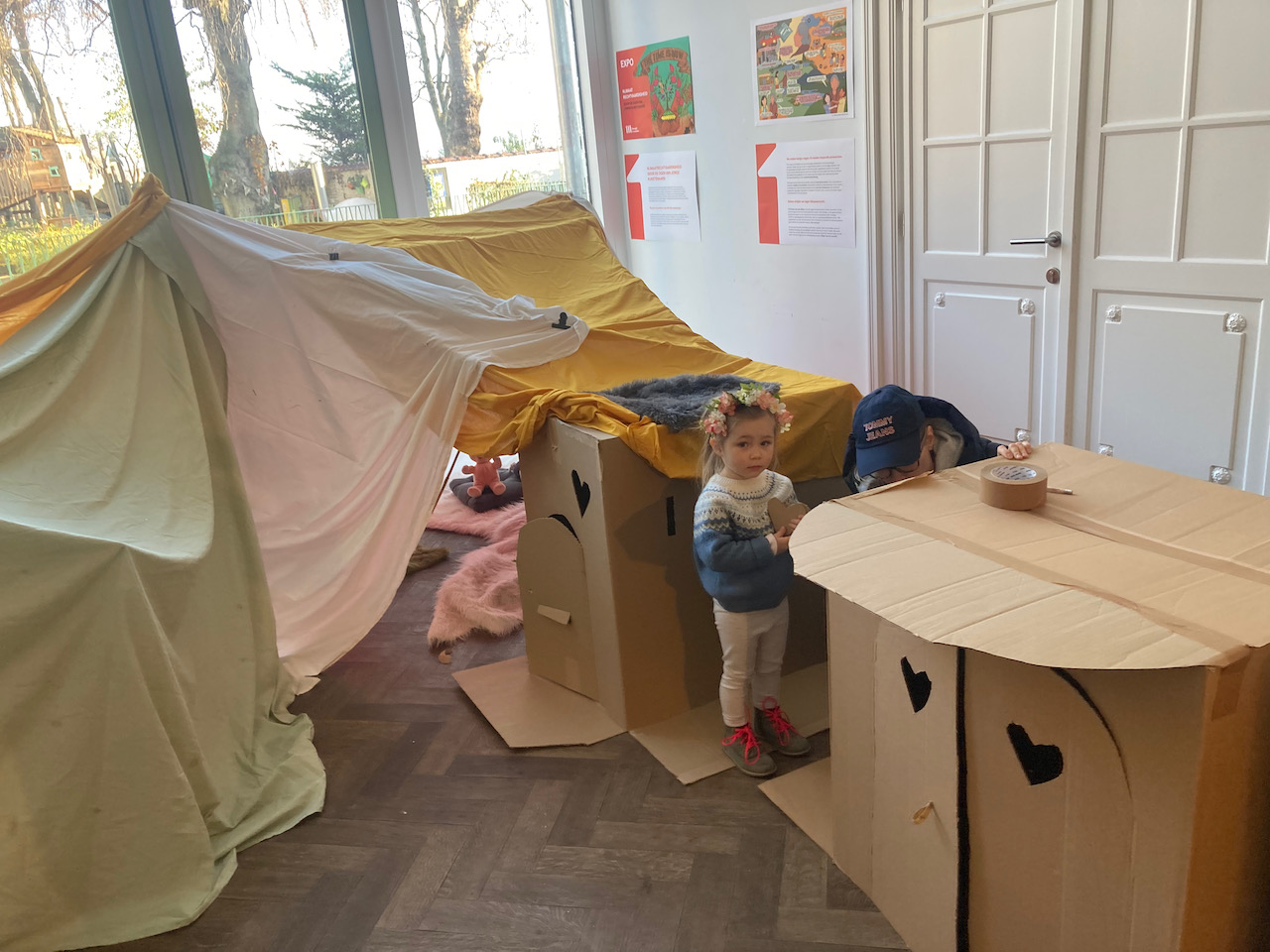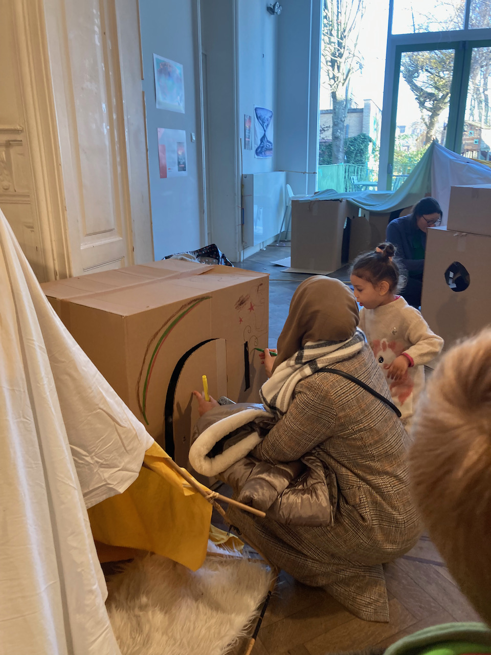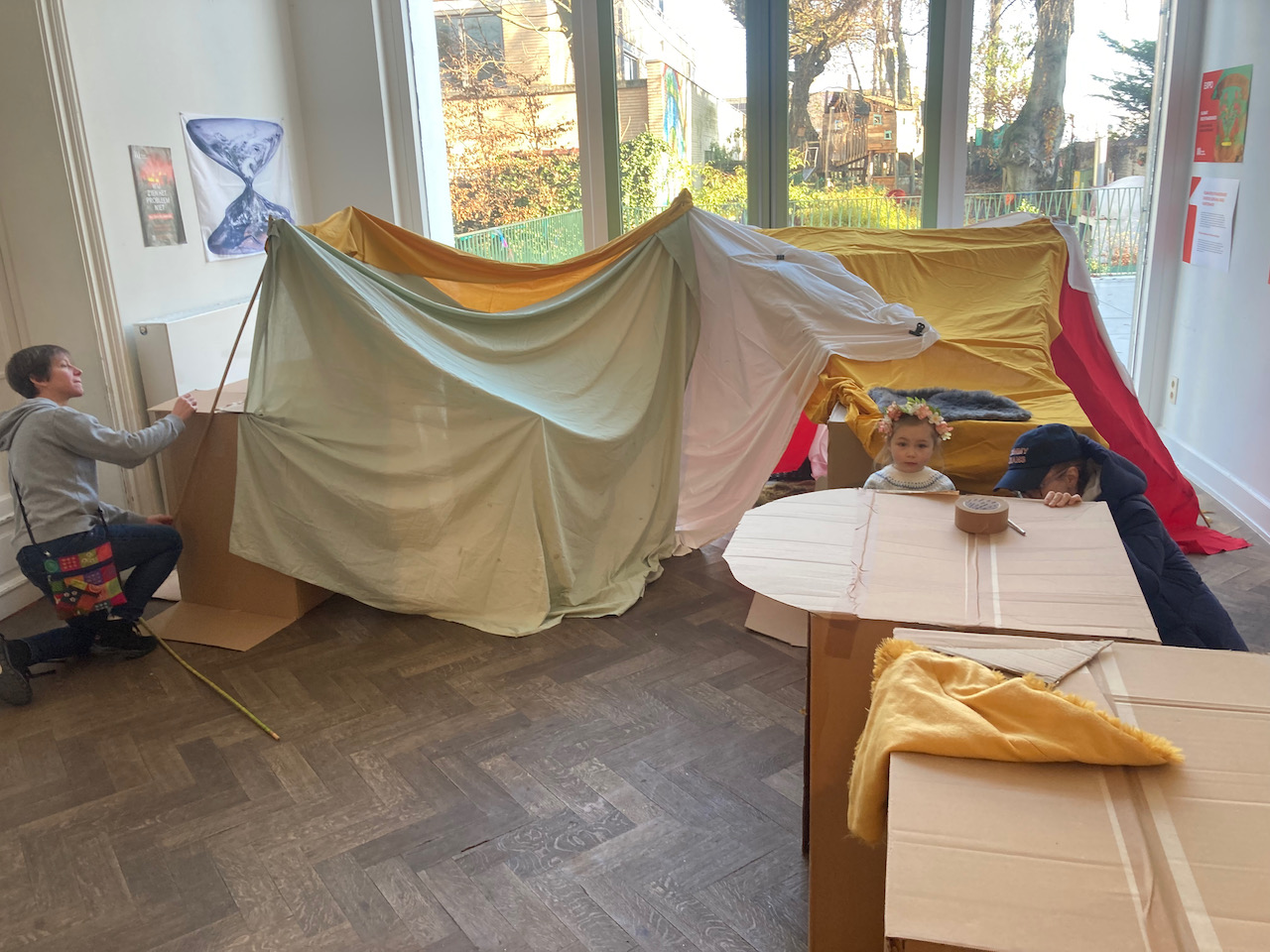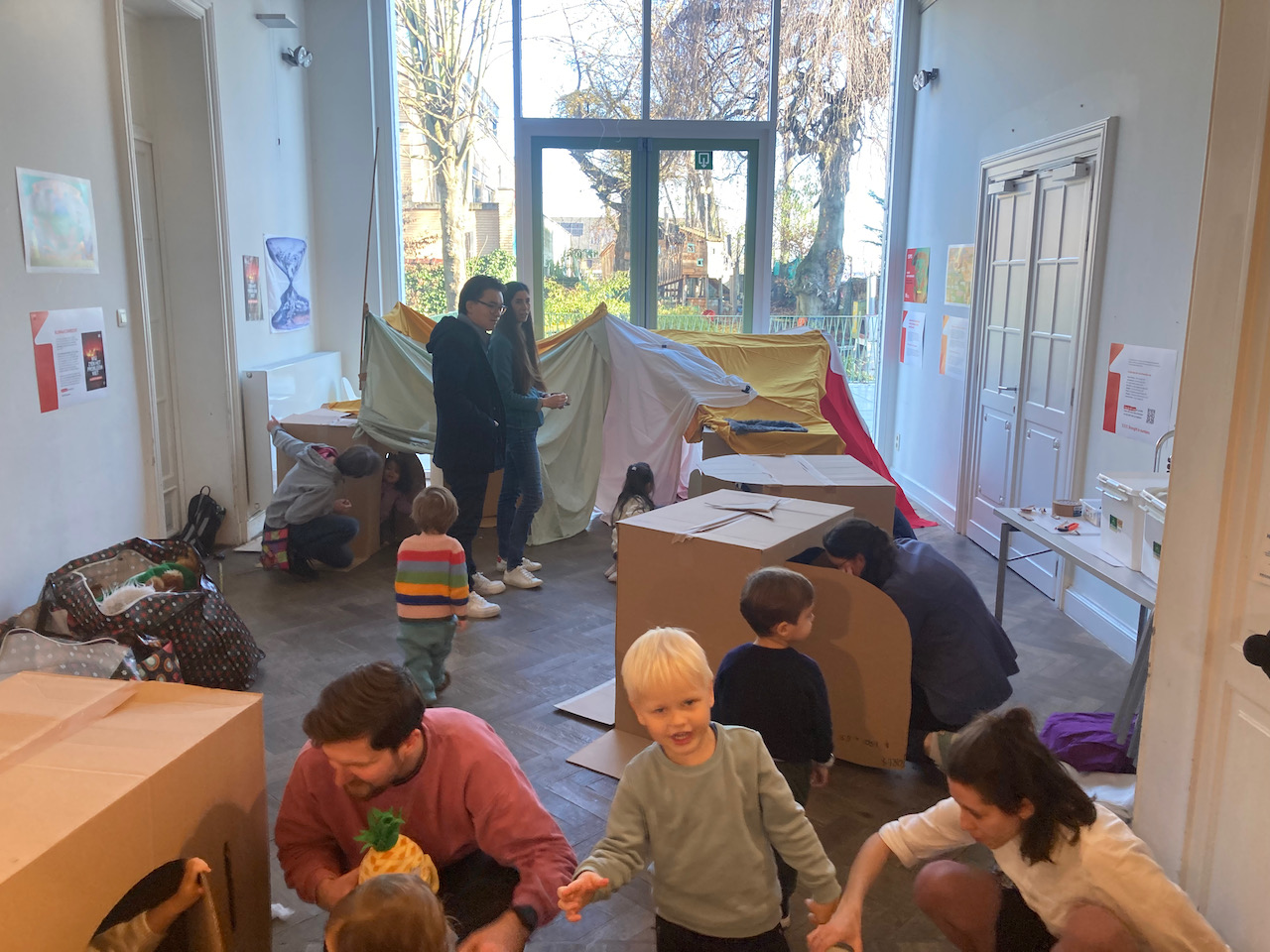 In het kader van Café-O-Lait een project van het GC Elzenhof gaf Mister Box een bouwatelier met bamboe/textiel en karton en veel knuffels….