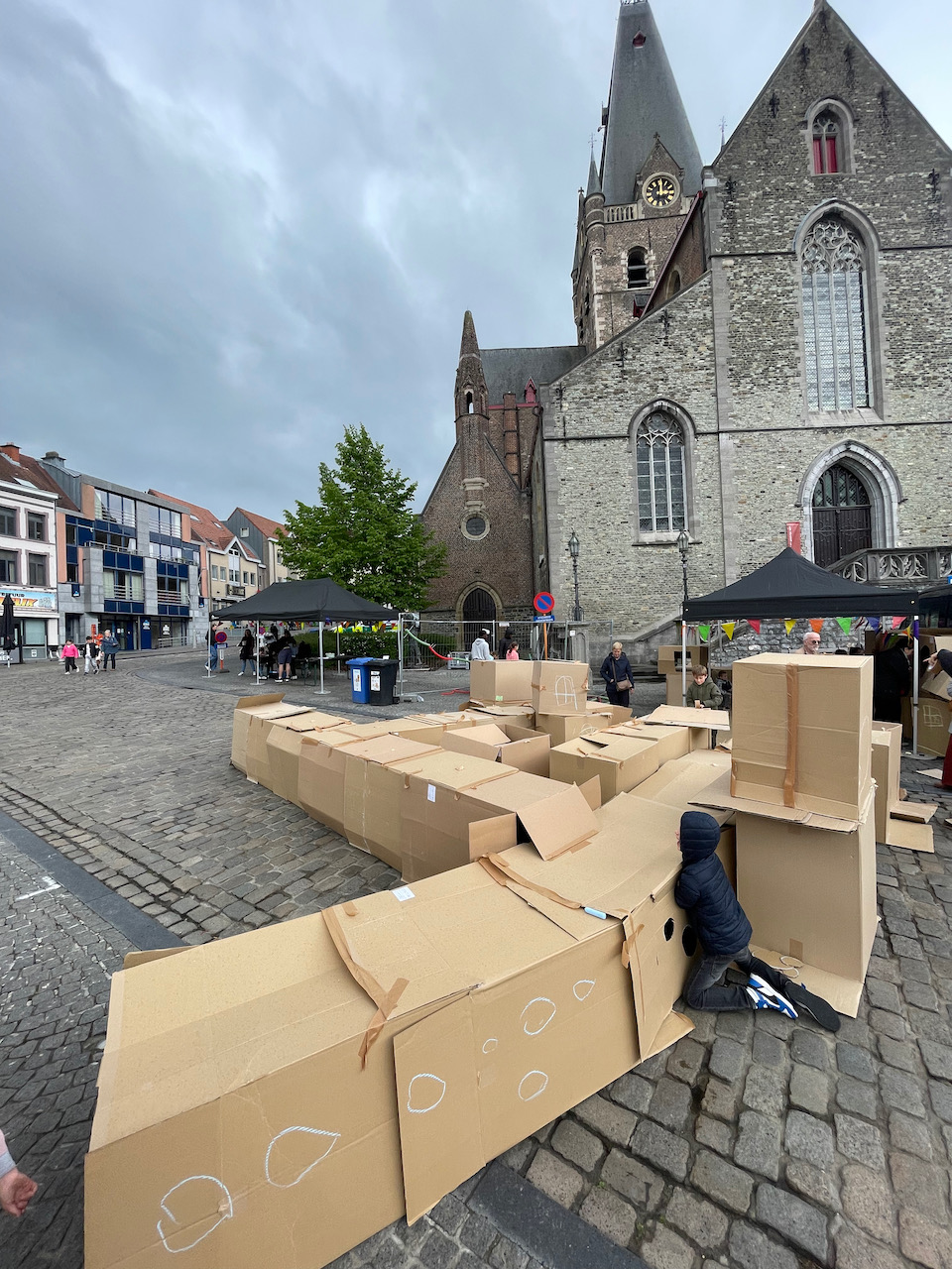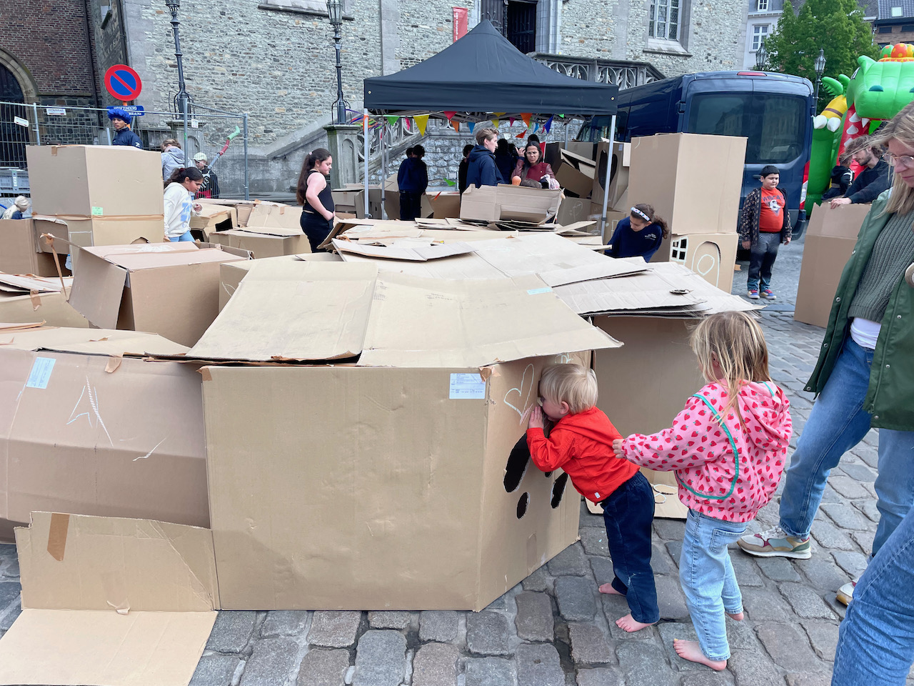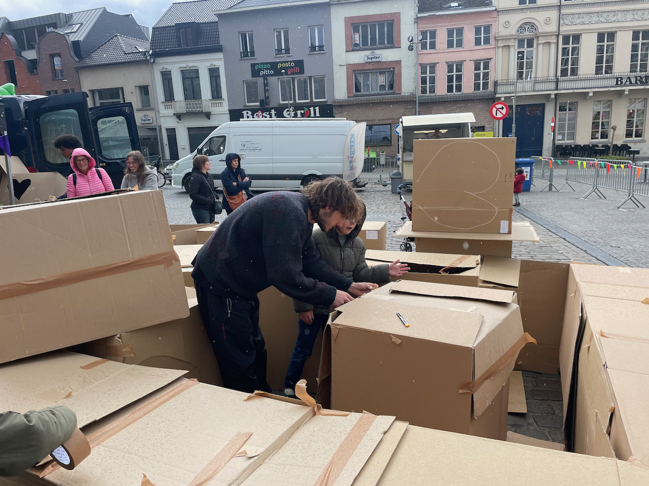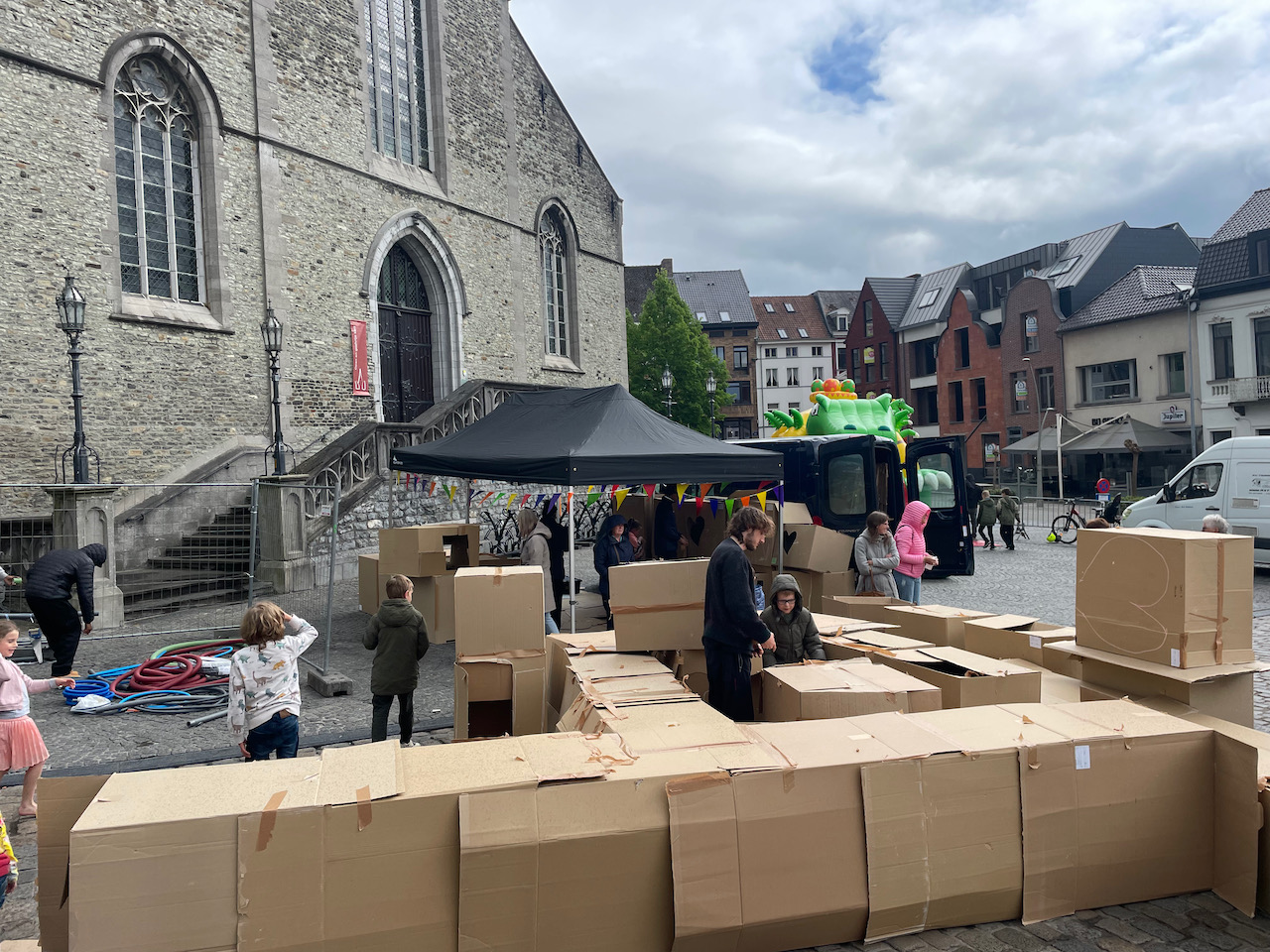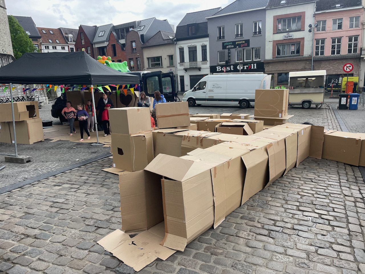 Deze keer op het grote marktplein van Geeraardsbergen. Huizen, kastelen en zelf een doolhof in karton op kindermaat. Samen met zijn team gingen we de strijd aan tegen de vele springkastelen:)