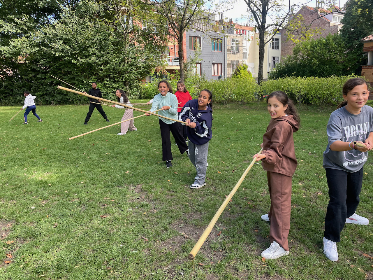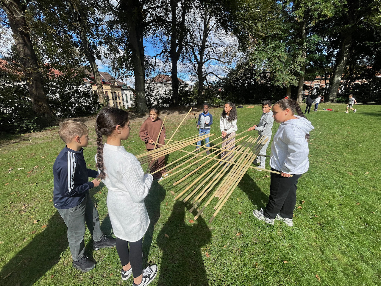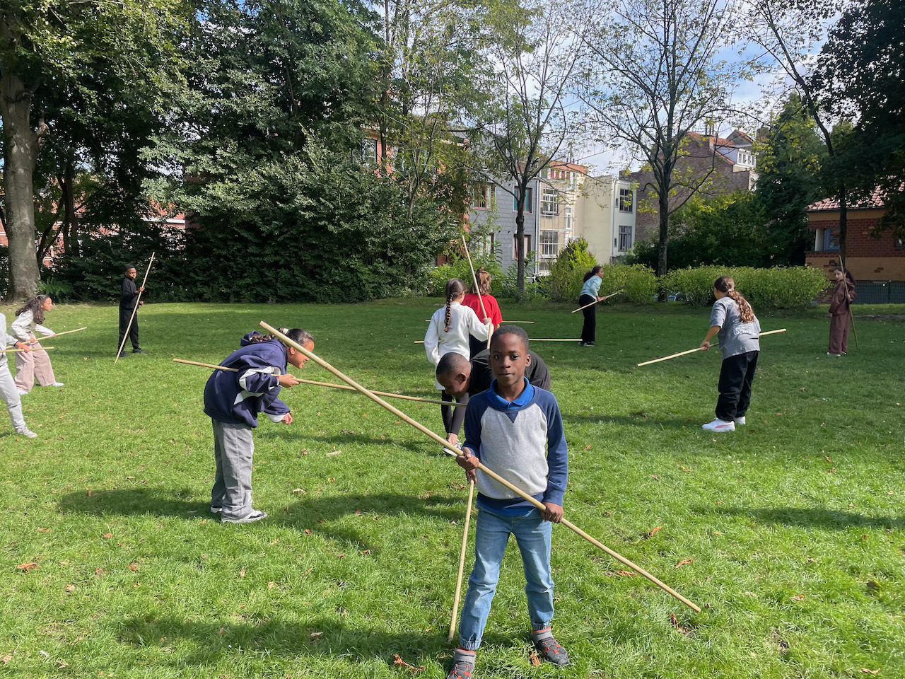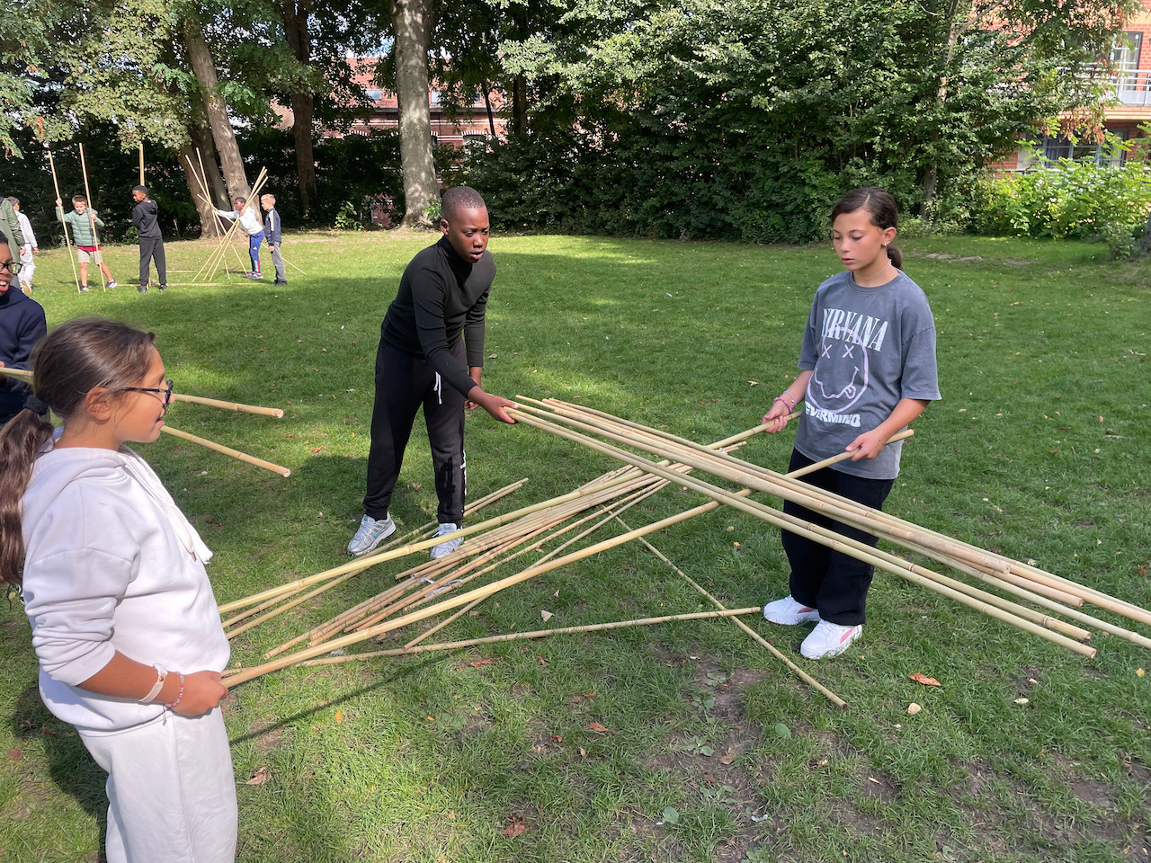 Een groot veld , 100 bamboestokken van 220 cm, een gemotiveerde klas derdegraadsleerlingen en wat zon.Meer moet je niet hebben.