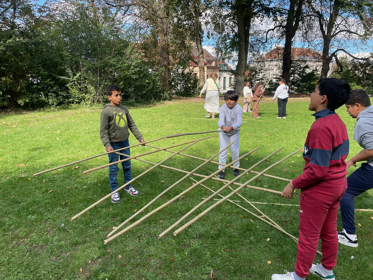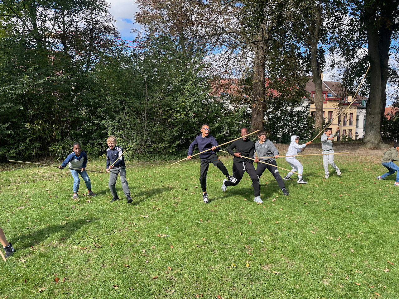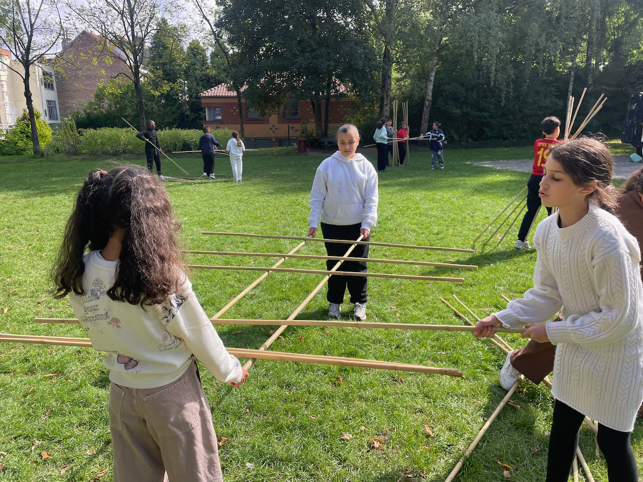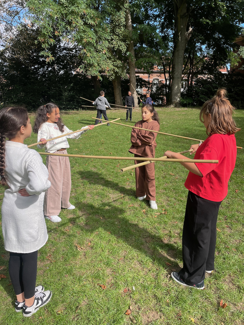Een groot veld , 100 bamboestokken van 220 cm, een gemotiveerde klas derdegraadsleerlingen en wat zon.Meer moet je niet hebben.