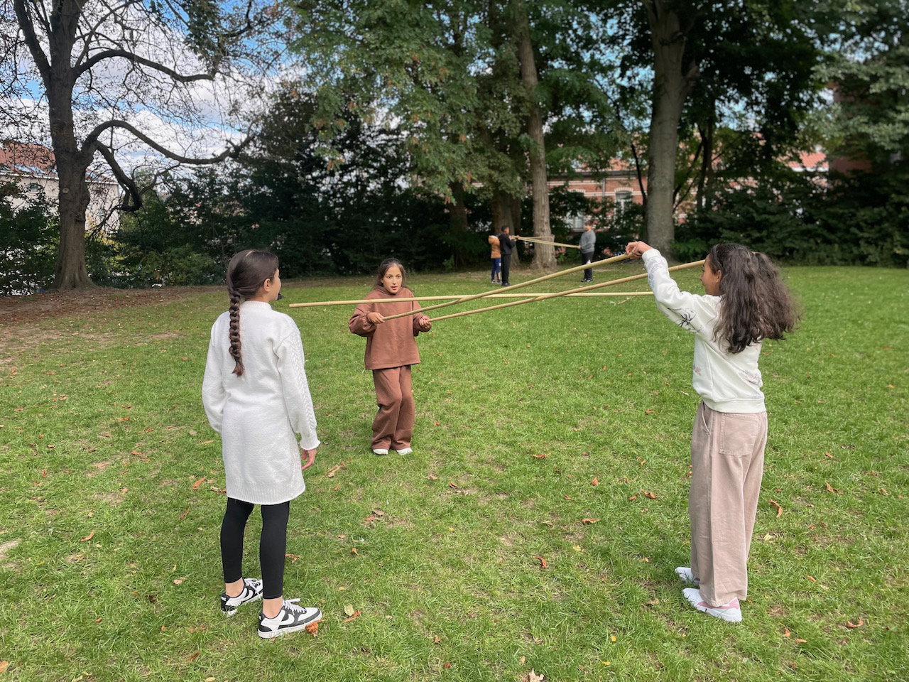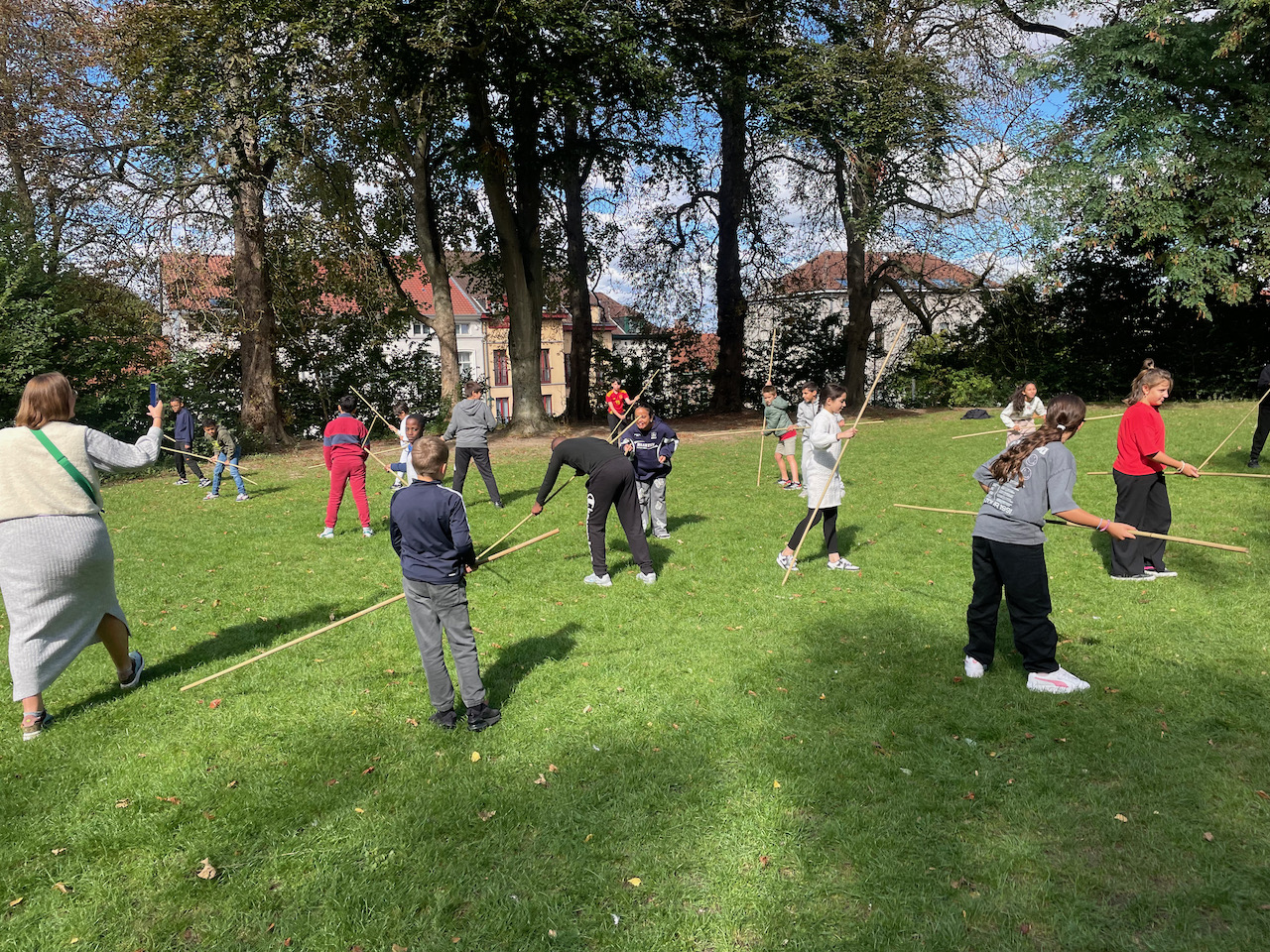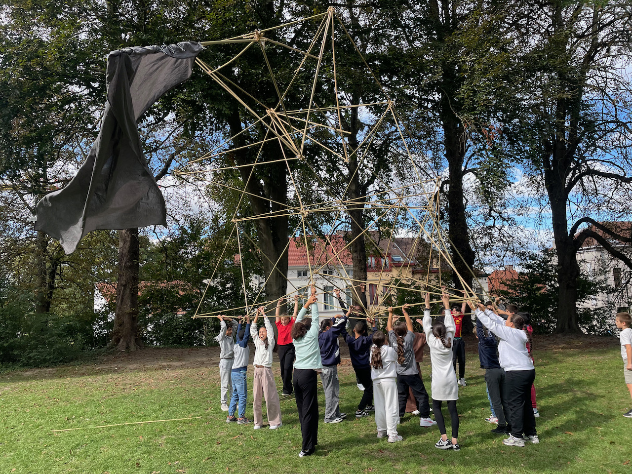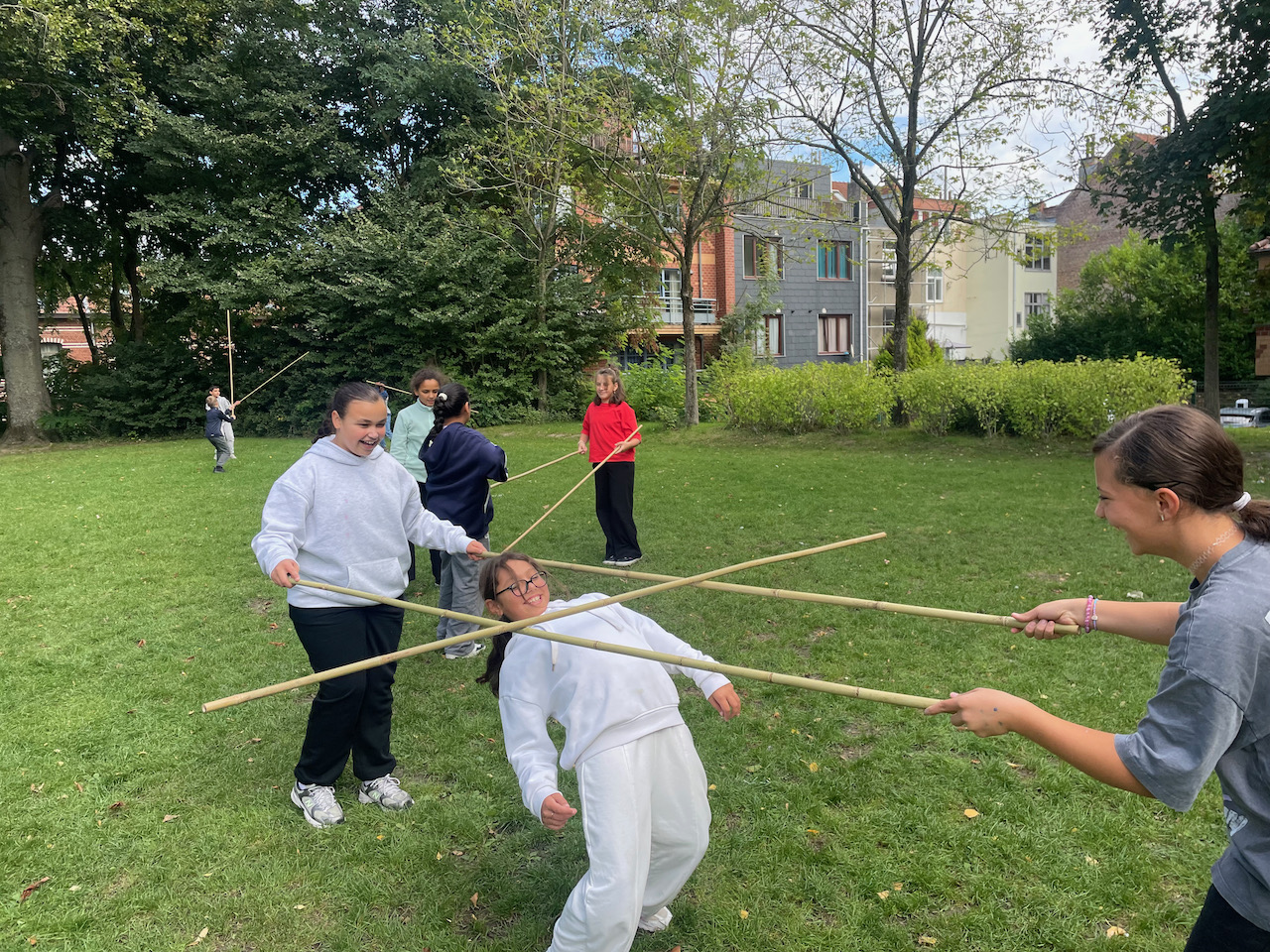 Een groot veld , 100 bamboestokken van 220 cm, een gemotiveerde klas derdegraadsleerlingen en wat zon.Meer moet je niet hebben.